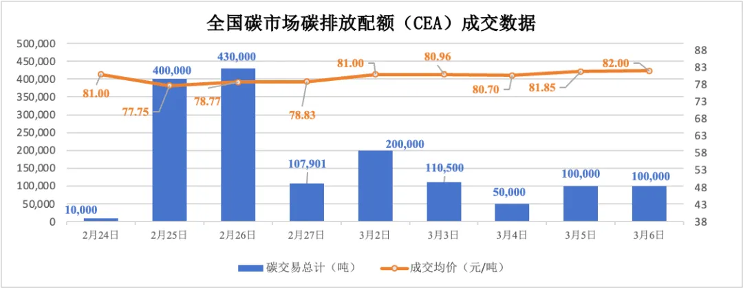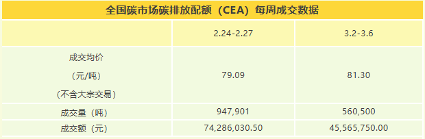 3月2日-3月6日,全国碳市场碳排放配额(CEA)总成交量560,500吨,总成交额45,565,750.00元。