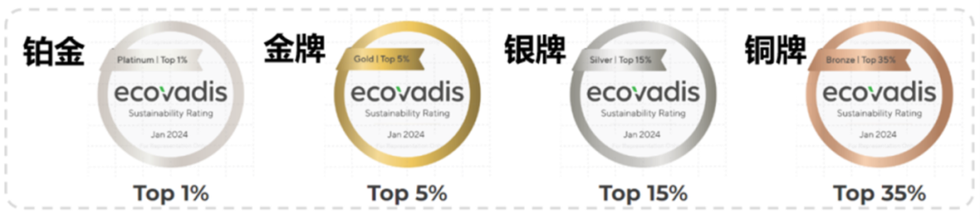 根据企业的EcoVadis评分在所有EcoVadis评级企业中的百分比排名,符合获得相关奖牌或奖章资格的,EcoVadis会授予相应的奖牌或奖章。EcoVadis奖牌将颁发给所有EcoVadis评级客户中排名前35%的公司。奖牌等级如下: