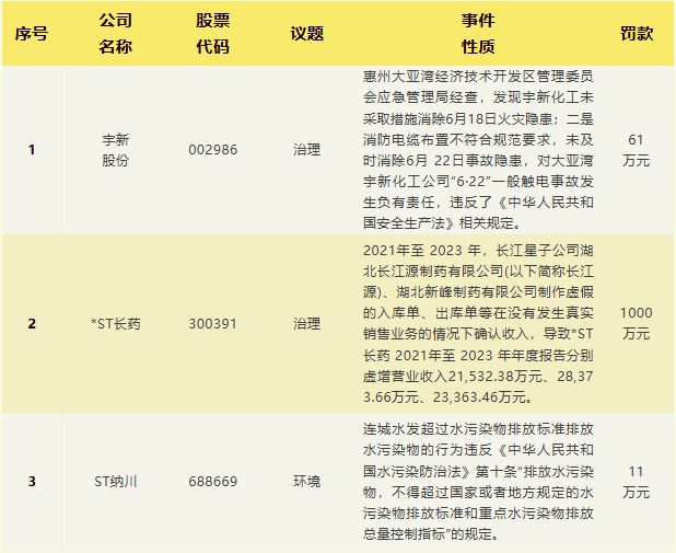 治理|宇新股份;*ST长药